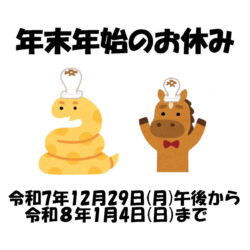 今年も残すところ1か月をきりましたね・・ 1年なんて本当にあっという間ですね💦 年末年始の休みのご案内です。 12/29(月)午後から1/4(……続きを読む